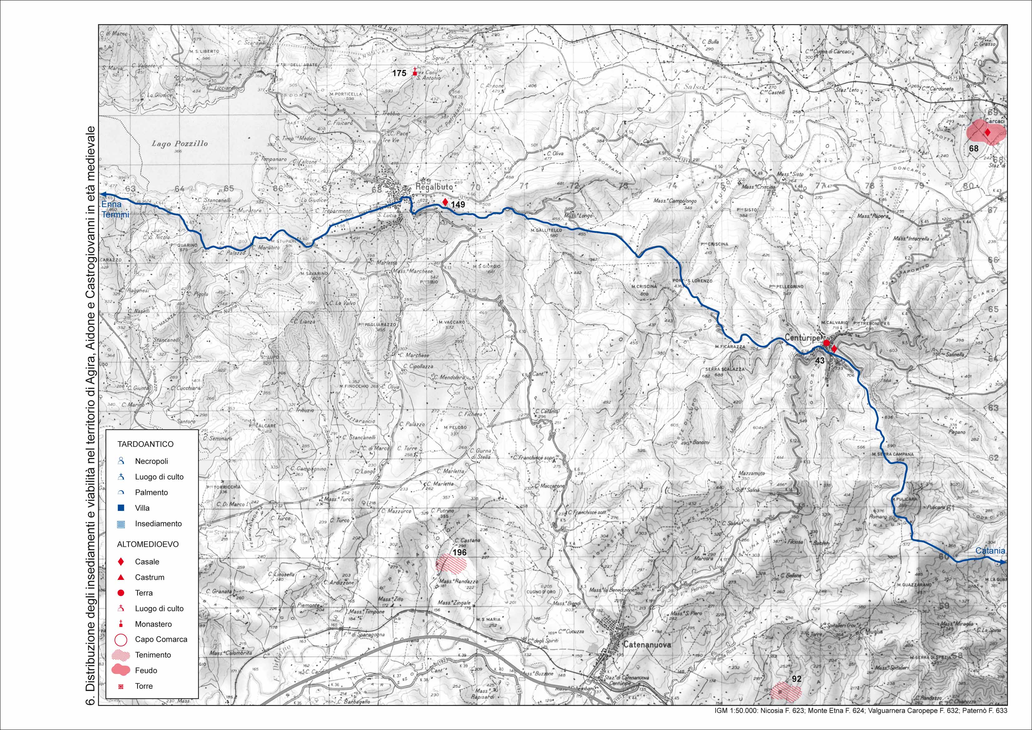 In particolare, ci si propone di verificare i possibili collegamenti tra la viabilita' e la distribuzione degli insediamenti, dei casali, dei castra e da ultimo, delle fondazioni monastiche basiliane al fine della ricostruzione di una geografia amministrativa del territorio, mediante un'indagine che non presuppone i limiti geografici e topografici della realta' da osservare, ma punta proprio a definirla attraverso la verifica della concreta proiezione nello spazio dei poteri radicati nel mondo urbano.